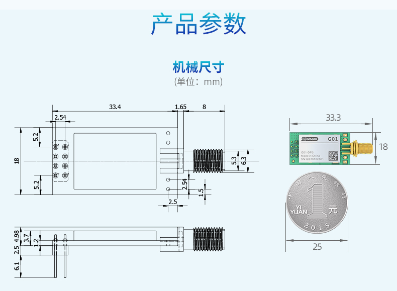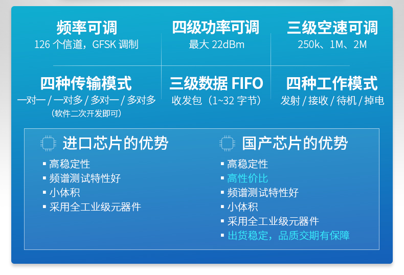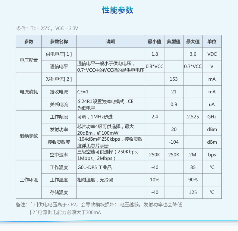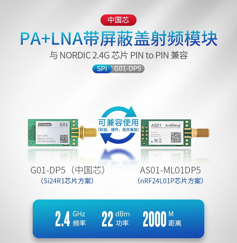 G01-DP5 是一款 2.4GHz,160mW,高速,高穩(wěn)定性,工業(yè)級,集無線收發(fā)于一體的數(shù)傳模塊。模塊采用杭州中科微原裝 Si24R1 射頻芯片與 AT2401 功放芯片,內(nèi)建 LNA,接收靈敏度提高 12dBm,工作在 2.4GHz~2.525GHz 的 ISM 頻段,帶有金屬屏蔽罩,抗干擾性能強。該模塊滿功率輸出,諧波小,頻體積小,部分器件達到了軍品級標準。