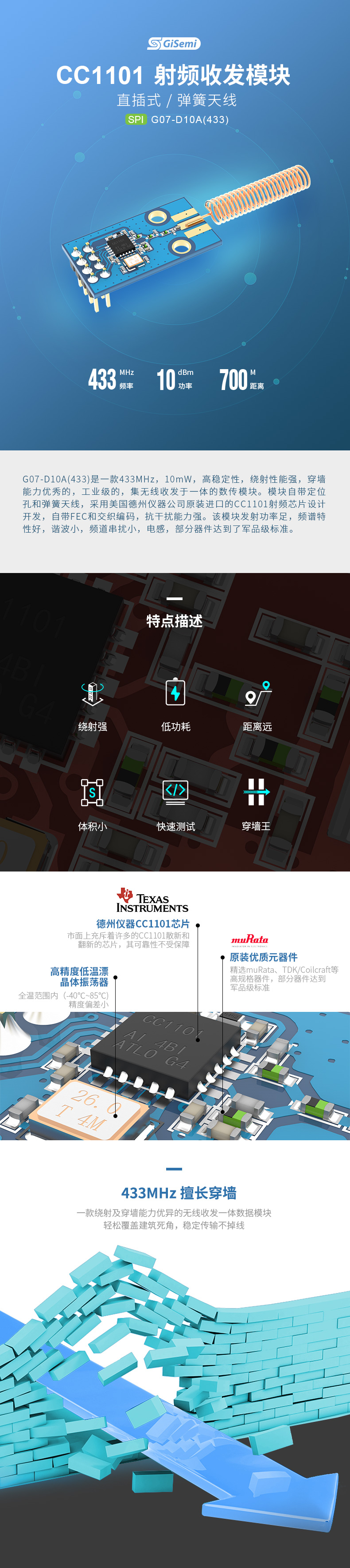 G07-D10A(433)是一款433MHz,10mW,高穩(wěn)定性,繞射性能強,穿墻能力優(yōu)秀的,工業(yè)級的,集無線收發(fā)于一體的數(shù)傳模塊。模塊自帶定位孔和彈簧天線,采用美國德州儀器公司原裝進口的CC1101射頻芯片設(shè)計開發(fā),自帶FEC和交織編碼,抗干擾能力強。該模塊發(fā)射功率足,頻譜特性好,諧波小,頻道串?dāng)_小,電感,部分器件達(dá)到了軍品級標(biāo)準(zhǔn)。