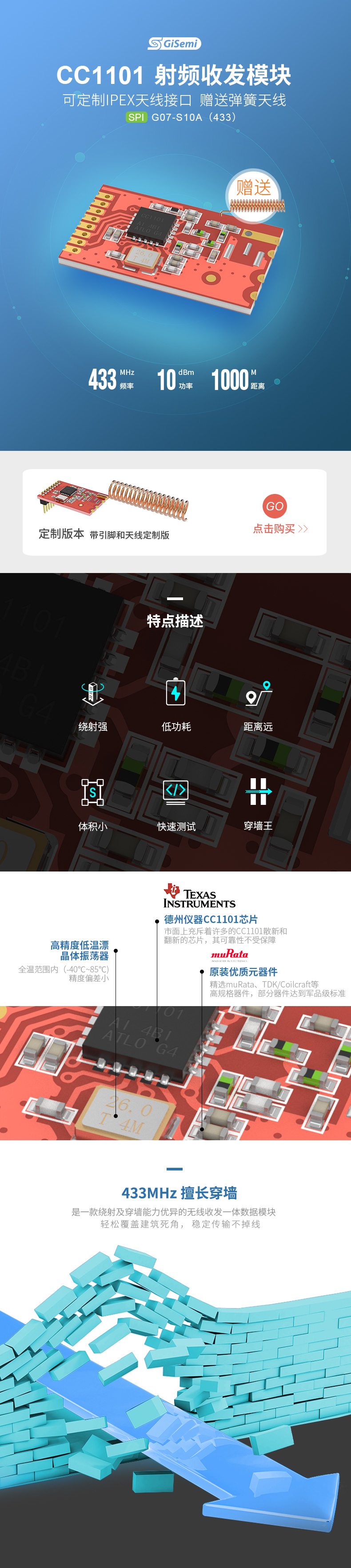 G07-S10A(433)是一款433MHz,10mW,高穩(wěn)定性,繞射及穿墻能力優(yōu)秀的,工業(yè)級(jí)的,集無(wú)線收發(fā)于一體的數(shù)傳模塊。模塊采用美國(guó)德州儀器公司原裝進(jìn)口CC1101射頻芯片設(shè)計(jì)開(kāi)發(fā),自帶FEC和交織編碼,抗干擾能力強(qiáng)。該模塊發(fā)射功率足,頻譜特性好,諧波小,頻道串?dāng)_小,體積超小,采用高精度晶振,電感,部分器件達(dá)到了軍品級(jí)標(biāo)準(zhǔn)。