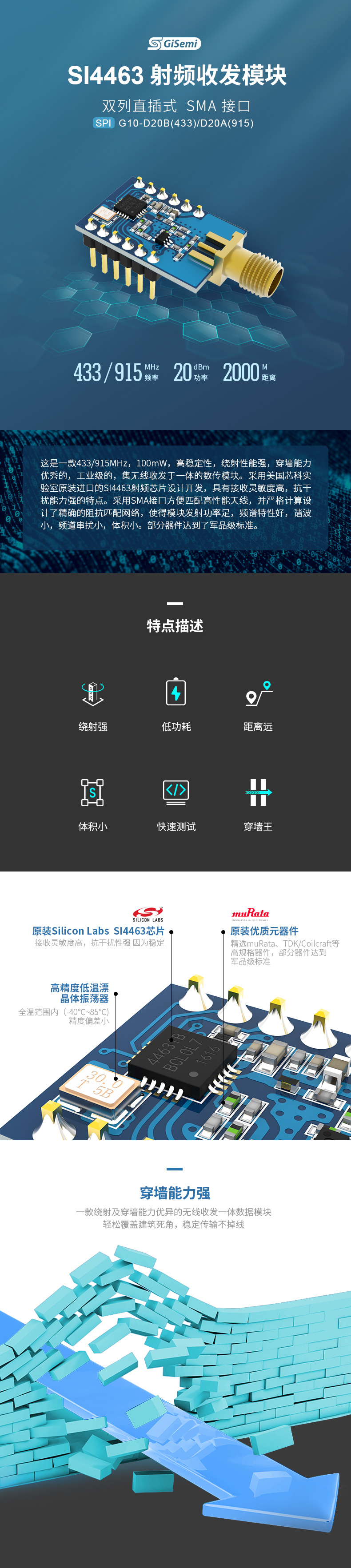 這是一款433/915MHz,100mW,高穩(wěn)定性,繞射性能強(qiáng),穿墻能力優(yōu)秀的,工業(yè)級(jí)的,集無(wú)線收發(fā)于一體的數(shù)傳模塊。采用美國(guó)芯科實(shí)驗(yàn)室原裝進(jìn)口的SI4463射頻芯片設(shè)計(jì)開(kāi)發(fā),具有接收靈敏度高,抗干擾能力強(qiáng)的特點(diǎn)。采用SMA接口方便匹配高性能天線,并嚴(yán)格計(jì)算設(shè)計(jì)了精確的阻抗匹配網(wǎng)絡(luò),使得模塊發(fā)射功率足,頻譜特性好,諧波小,頻道串?dāng)_小,體積小。部分器件達(dá)到了軍品級(jí)標(biāo)準(zhǔn)。