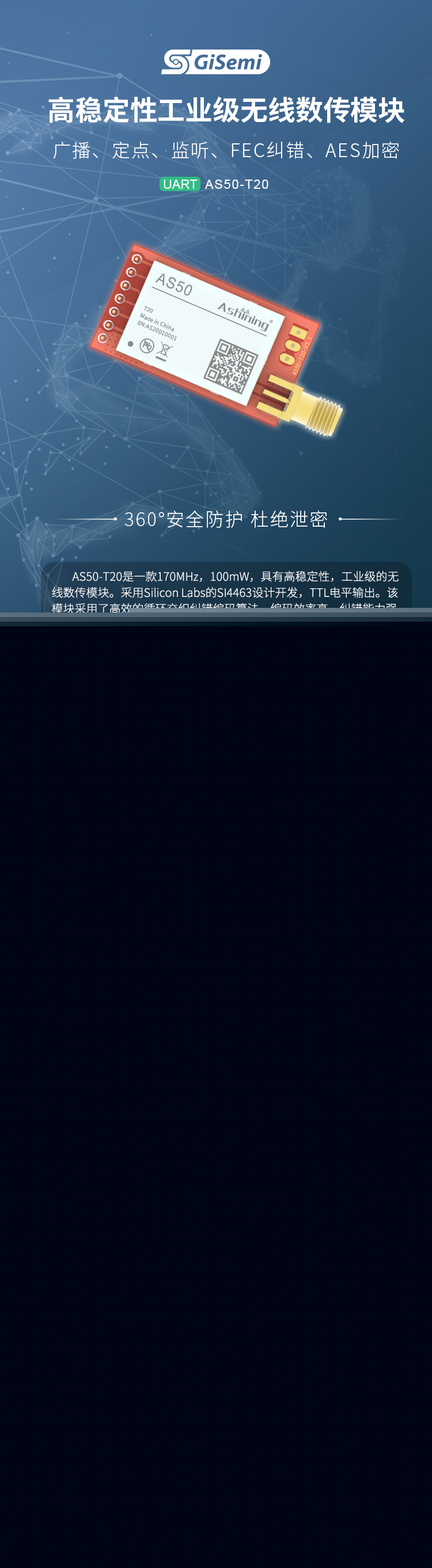169MHz , 100mW,無線串口模塊,廣播、定點、監(jiān)聽、FEC糾錯、AES加密