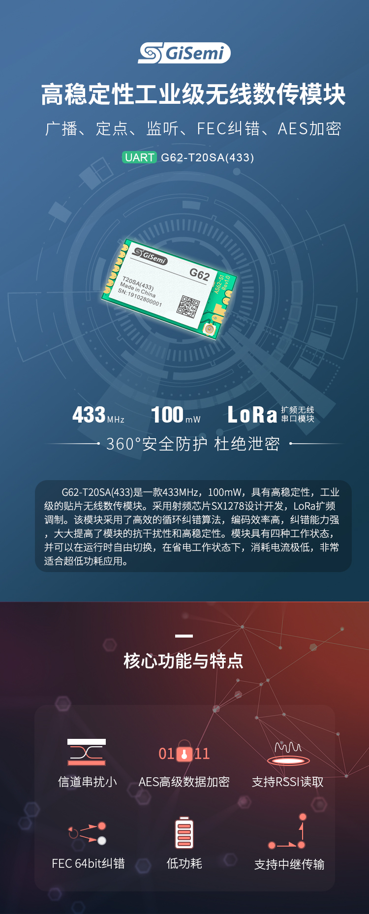 433MHz , 100mW,LORA擴頻無線串口模塊,廣播、定點、監(jiān)聽、FEC糾錯、AES加密