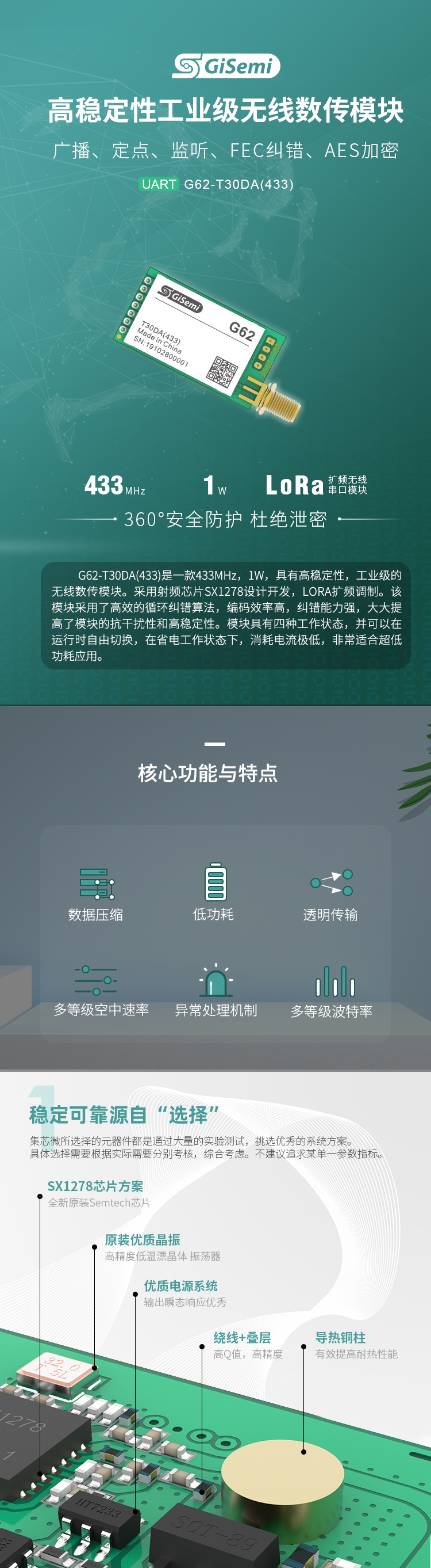 433MHz , 1W,LORA擴(kuò)頻無(wú)線串口模塊,廣播、定點(diǎn)、監(jiān)聽、FEC糾錯(cuò)、AES加密