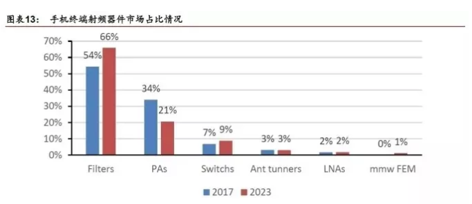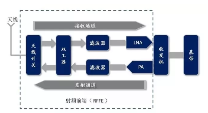 射頻前端模組的主要包括功率放大器(PA)、雙工器(Duplexer)、射頻開關(guān)(Switch)、濾波器(Filter)、低噪放大器(LNA) 等元件。