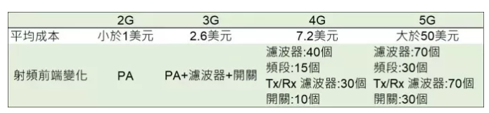 而隨著進(jìn)入5G,更多的頻段導(dǎo)入,以及涵蓋更多新技術(shù),使得射頻前端零組件的價(jià)值不斷上升。